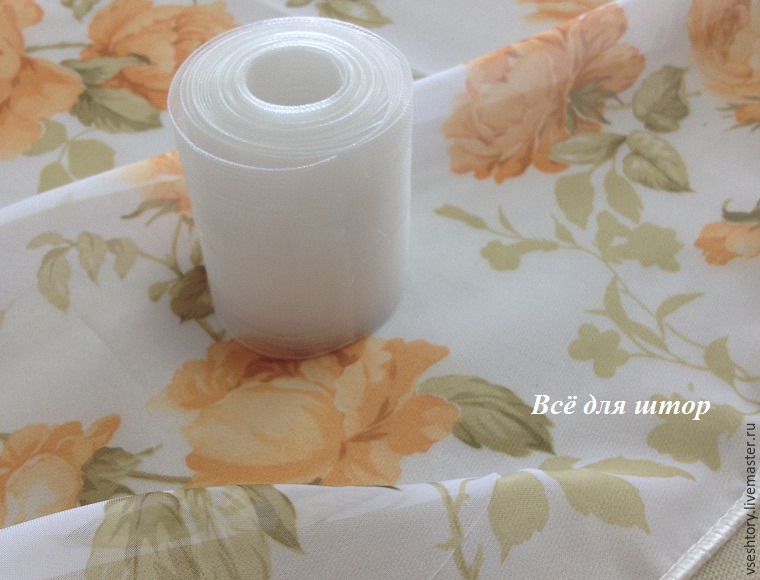 2. Шторная тесьма не меньше 6 см в высоту и длиной, равной расходу ткани + 5 см. То есть, если, допустим, у вас карниз длиной 1,5 м, то ткани мы будем брать 2,7-3 м, соответственно, тесьмы на 5 см больше.