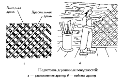 Если вы решили оштукатурить стены, изготовленные из дерева, то перед нанесением штукатурной смеси необходимо изготовить и закрепить по всем обрабатываемым поверхностям специальную сетку (дранку) из деревянных реечек. Дранка в сетчатой форме набивается на стену постепенно, важный момент — гвозди заколачиваются не до конца, половина гвоздя вместе с шапкой загибается в сторону.