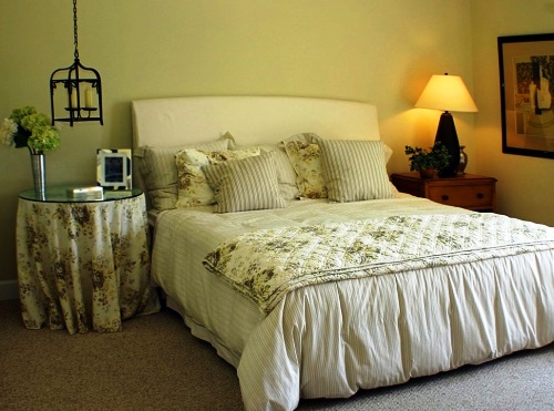 Прекрасно будет выглядеть спальня с лавандовыми стенами и кремовой мебелью, винтажная вазочка на туалетном столике и пара вязаных салфеток не будут лишними.