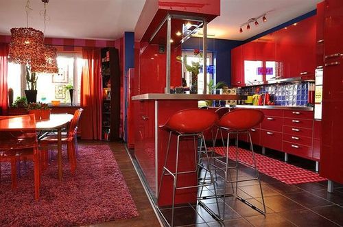 - Чересчур ярким сочетанием выступит красный с оттенками оранжевого. Но и эта комбинация имеет право на жизнь при реализации опытным дизайнером. Если красными будут только шторы и несколько акцентов в рабочей зоне кухни – посуда, техника и др., то дуэт будет вполне гармоничным. Важно не переборщить с огненным тоном.