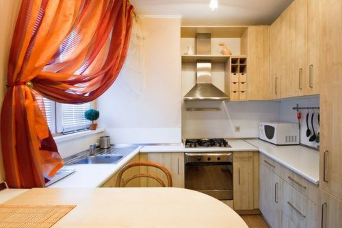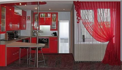 В последнее время в оформлении кухни многие предпочитают использовать яркие и броские детали, привлекающие внимание и создающие позитивное впечатление. В качестве таких элементов вполне могут выступать шторы какого- либо яркого оттенка, например, красного или оранжевого (см. фото). Они внесут в ваш интерьер немного радости и хорошего настроения и создадут на кухне нужную атмосферу. Однако обращаться с такими заметными деталями, как красные или оранжевые портьеры, нужно очень осторожно. Малейшая ошибка может испортить весь эффект и создать совершенно ненужное впечатление.