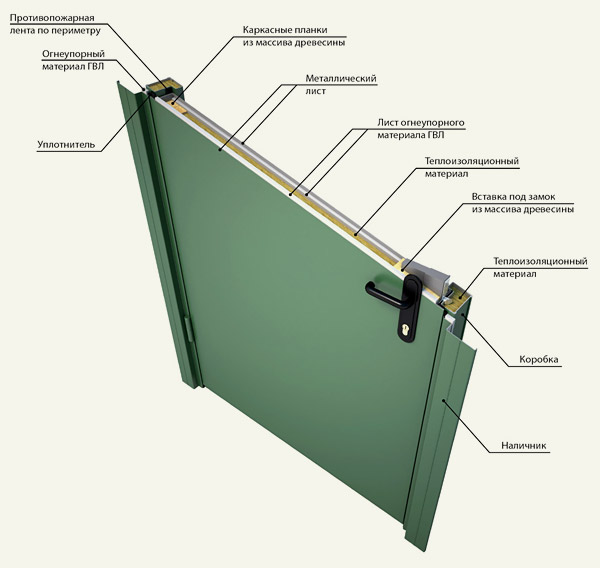 Производство этого устройства связывается с постановкой двойных слоев фальца и уплотнителя, не поддерживающего горение. Изнутри дверь наполняется материалом, способствующим хорошей изоляции тепла. По краю дверного полотна крепится термолента, сдерживающая движение пламени.