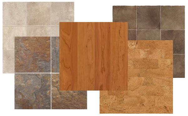 Виды напольных покрытий: паркетная доска, линолеум, кафельная плитка, пробка.