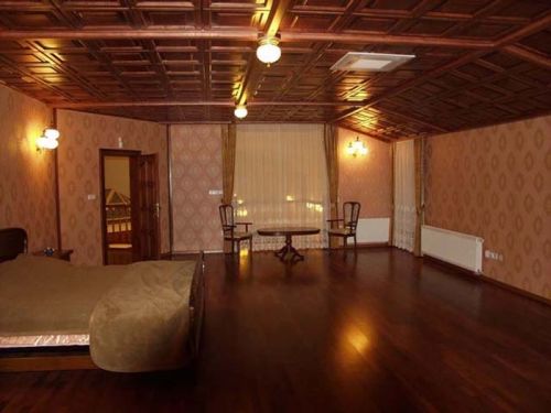 - большая кровать с деревянными ножками и спинками;