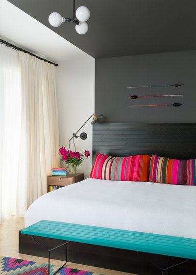 Одно из золотых правил дизайна гласит, что в каждой комнате должно быть немного черного цвета для скрепления композиции. Вот вам еще один факт: сочетание оранжевого и синего чаще других используется в рекламе, чтобы привлечь мужскую аудиторию (вспомнить хотя бы цвета бейсбольной команды New York Mets). Безусловно, цвет для спальни — ключевой параметр, но как много цвета должно быть в комнате? Пары деталей иногда бывает вполне достаточно.