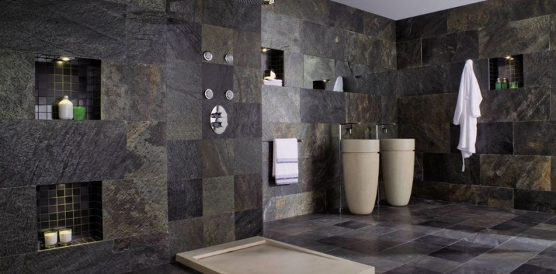 Если же у вас ванная комната большого размера, то можно оформить ее в урбанистическом стиле. Как правило, создание такого интерьера требует стен, имитирующих «голый» бетон, но можно выполнить отделку и фактурной плиткой темных оттенков, а лучше использовать натуральный камень или плиты керамогранита. В последнее время набирает популярность матовая плитка достаточно крупного размера с фактурой натурального камня или древесины. Примеры, фото ванной комнаты с плиткой темных оттенков представлены ниже.