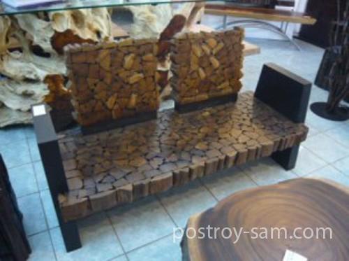 3. Скамейка из спилов. Для изготовления такой скамейки нужно распилить бревна на поперечные срезы, а затем задекорировать ими скамейку, сделанную из любых простых материалов. Скамейка получится довольно эффектной. Для того, чтобы придать скамейке более цельный вид, нужно обязательно наклеить кусочки бревен или спилы на торцы скамейки.