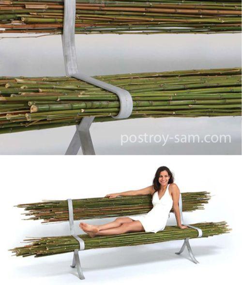 4. Скамейка из бамбуковых палочек или веток. Для такой скамейки потребуется изготовить железный каркас, а спинку и сиденье можно сделать из бамбука, если в наличии есть много такого материала, или из вязанок, собранных из ровных веток, к примеру, орешника. Такая скамейка довольно проста и в то же время необычна.