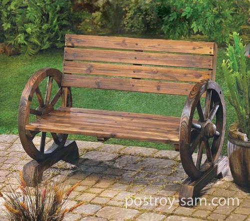 1. Скамейка с колесами. Это практически обыкновенная деревянная скамейка, но имеющая вместо поручней колеса, что смотрится довольно интересно и сразу напоминает о ковбоях, телегах и лошадях.