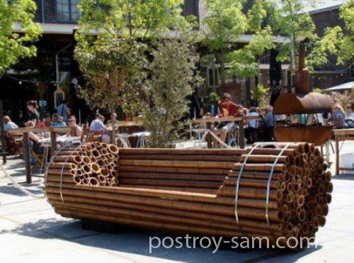 9. Если вы проживаете там, где растет бамбук или у вас есть много такого материала, то можно изготовить из него оригинальную и довольно простую скамейку. Для этого всего лишь потребуется стянуть прочной проволокой или металлическими пластинами бамбучины, имеющие разную длину.