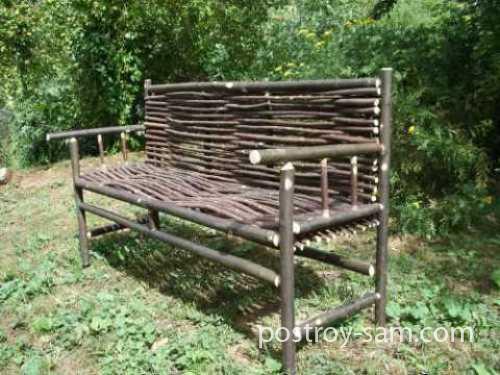 5. Можно соорудить скамейку, у которой каркас изготовлен из тонких бревен, соединенных особым способом, а сиденье и спинка сделаны из орешника по типу плетня. Такая скамейка проста, бюджетна и смотрится по дачному.