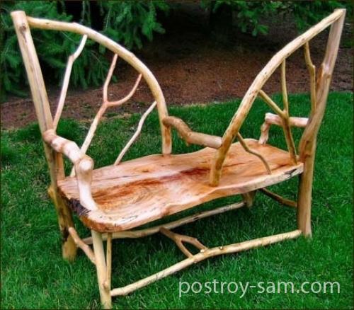 6. Скамейка деревянная двусторонняя. Скамейка, имеющая природную форму, очень красиво смотрится на даче и, поэтому, такая мебель предпочтительнее. Можно съездить в лес и поискать там кривые интересные веточки, а затем из них сделать такую скамейку, которая украсит ваш сад и станет его изюминкой. В качестве сиденья нужно использовать широкую цельную доску, но, в крайнем случае, можно собрать его из нескольких досок, что никак не отразится на эффектности вашей скамейки.