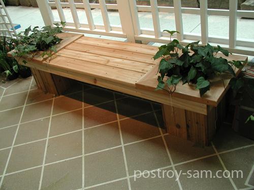 Проще всего будет сделать лавочку своими руками из дерева. Пара ненужных досок найдется у любого хозяина. А если еще имеются два крупно габаритных растения в деревянных кадках, то выйдет эксклюзивное изделие. Ящики или кадки используйте вместо ножек.