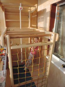 Если у вас дочка, установите ей небольшие качели, скалолазную стенку, балетный станок с зеркалом, велотренажер. Она с удовольствием позанимается с гимнастическим мячом, с обручем на коврике.