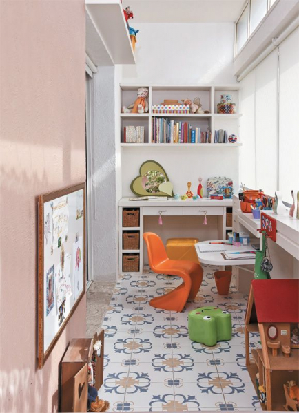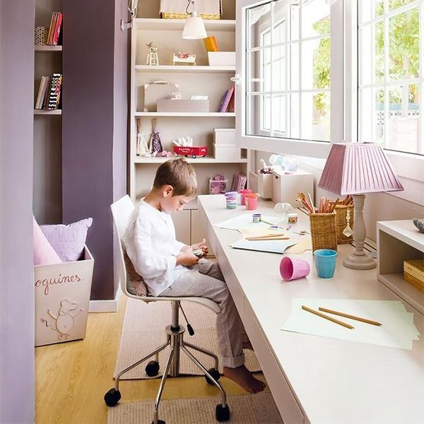 Для детей постарше из балкона можно сделать кабинет для уроков, научных экспериментов и творчества. Остатки перегородки между балконом и комнатой можно использовать в качестве начала рабочего стола или опоры для полочек, по боковым стенам обустроить встроенные шкафчики.