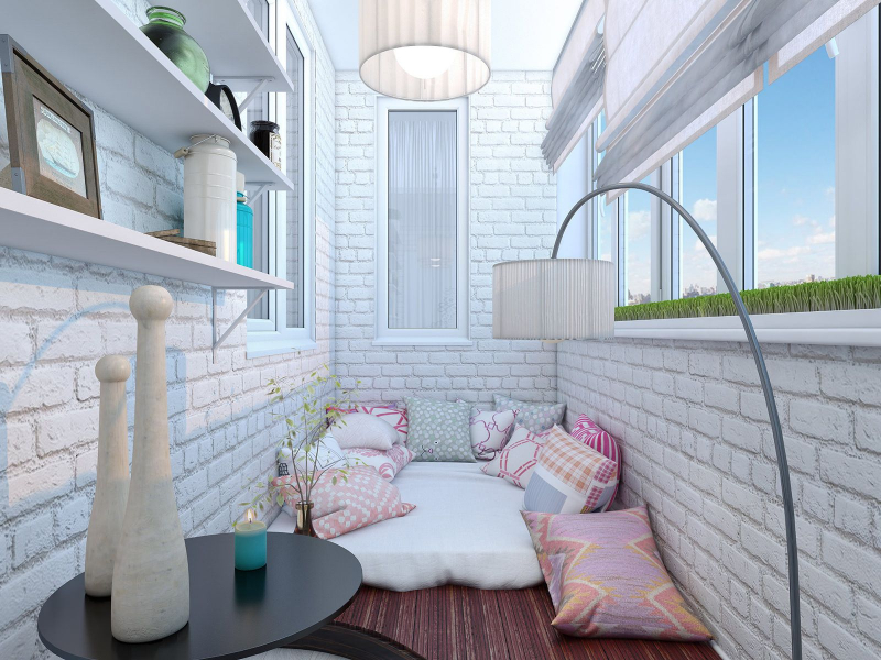 Балкон оформляется как уголок отдыха — для всей семьи или исключительно для детей. Здесь можно установить диван и проектор или телевизор. Получится весьма эффектный кинозал, пользоваться которым можно всей семьей.