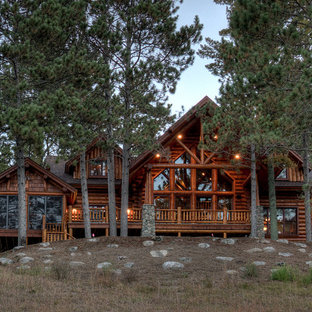 Идея дизайна: одноэтажный, деревянный дом в стиле рустика с двускатной крышей