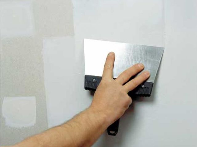 - Набирают немного средства на малый шпатель, накладывают на большой шпатель или кельму.