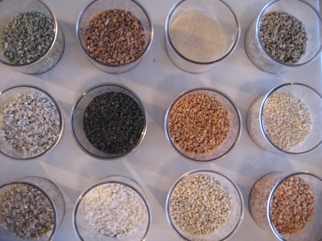 Состав наполнителя бывает различной формы: граненной и шарообразной с натуральными оттенками.