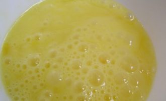 1. В миску отправьте яйца, кефир, соду, соль и сахар. Перемешайте все венчиком.