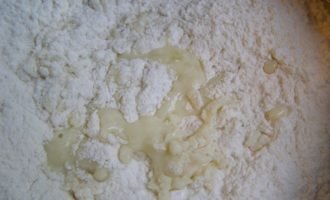 3. И теперь начинаем добавлять муку, которая обязательно должна быть просеяна. Хорошо перемешаем до полного объединения всех компонентов.
