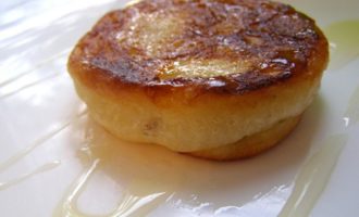 Я дожарила до конца (пока зарумянится низ), затем оставила оладьи на горячей сковороде под крышкой.