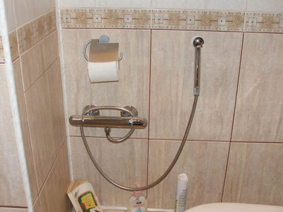 Смеситель для душа при помощи электродрели, дюбелей, крепежных элементов, находящихся в комплекте при покупке сантехники, устанавливается на стену в удобном месте, рядом с унитазом. Для установки встраиваемого в стену смесителя потребуется штробление стены дрелью-перфоратором, установка труб, подводка воды. Потом стена заделывается и выполняется финишная работа, например укладка плитки. На стену с использованием крепежных инструментов монтируется держатель для рукоятки душа со шлангом. Следует отметить, что при встроенном в стену душе во избежание протечек часто дополнительно устанавливают мини-раковину.