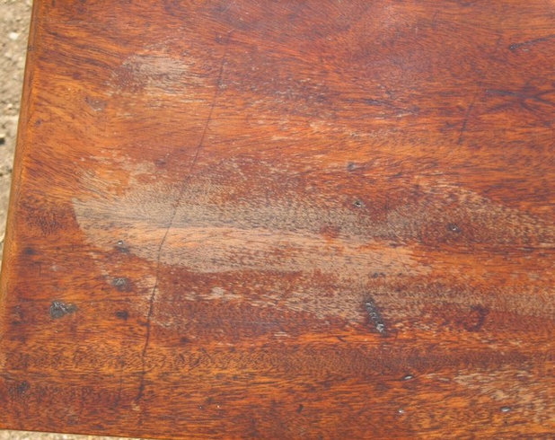 Если столешница лакированная, то при появлении на ней царапин или потертостей, как на фото, устранить их можно следующим образом: тканевый тампон смачивается в составе спирта и льняного масла, смешанных в пропорции 1:1.