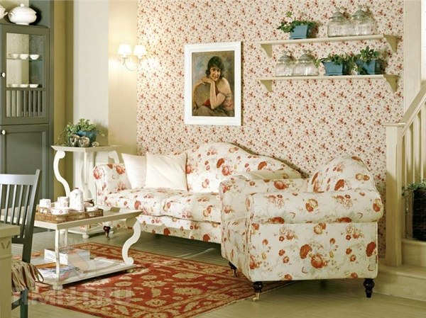 Романтичный прованс чаще всего выполнен в светлых тонах. Будут удачно смотреться обои с имитацией штукатурки, крашенной кирпичной кладки, или мелким цветочным узором.
