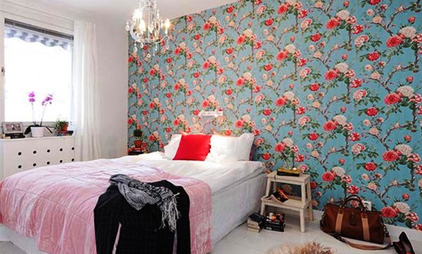 Кстати! Если все стены сделать яркими, использовав для их оформления комбинации рисунков с пестрыми, мелкими и крупными цветами, то это, с одной стороны, создает дополнительный уют, но с другой, такое помещение визуально уменьшается в объеме. Часто главной задачей в современном интерьере является создание акцента на яркую часть комнаты. И обои с цветами, как раз и способны стать тем самым «свежим пятном».
