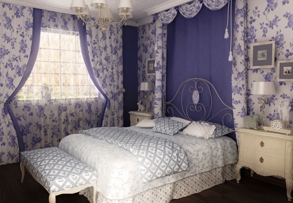 При помощи фотообоев можно выделить зону над изголовьем кровати, тем самым украсив ее и обозначив центральную точку в маленькой комнате. В интерьере прованс гармонично будут смотреться светлые пастельные тона, мятный, розовый, белый, светло-фиолетовый, голубой и персиковый.