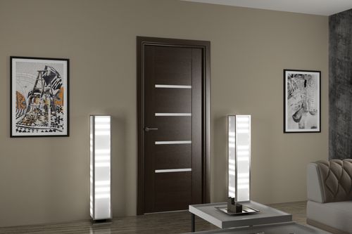 Иногда, в дверях делают стеклянную вставку матовую, прозрачную или затемненную. Такие модели более красивы и необычны, также стекло позволяет видеть, что происходит внутри комнаты. Чаще, такие полотна ставят на кухню, столовую или гостиную. Конструкции с матовыми вставками хорошо смотрятся в ванной.