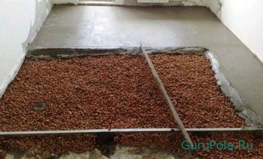 - Плиты непосредственно ложатся на керамзит (ГВЛ, пеноплекс). В этом случае фракция должна быть минимальной до 4 – 5 мм. Так как вся нагрузка от пола будет приходиться именно на засыпку. Рекомендуемая толщина засыпки до 6 см. Керамзит выполняет тут больше роль выравнивающего элемента. Поэтому достаточно часто при таком способе применяют дополнительные утепляющие элементы (пеноплекс, к примеру). При интенсивных динамических нагрузках такой пол быстро расшатается (зал для занятий спортом, стиральные машины и т.д.);