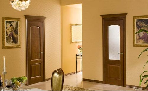 Коробка двери в этом случае также изготавливается из того же дерева, что и каркас. Фурнитура, которая предлагается для бюджетного варианта дверей, выполнена из стали с хромированным, бронзовым или матовым покрытием.