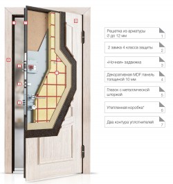 Взломать дверь невероятно тяжело. Кроме того, что применяется качественный металл большой толщины, конструкция предусматривает специальную вставку. Это многослойный блок, представляющий собой настоящую композитную броню из слоев разных физических свойств. Общая толщина этой непробиваемой защиты – 15,5 мм.
