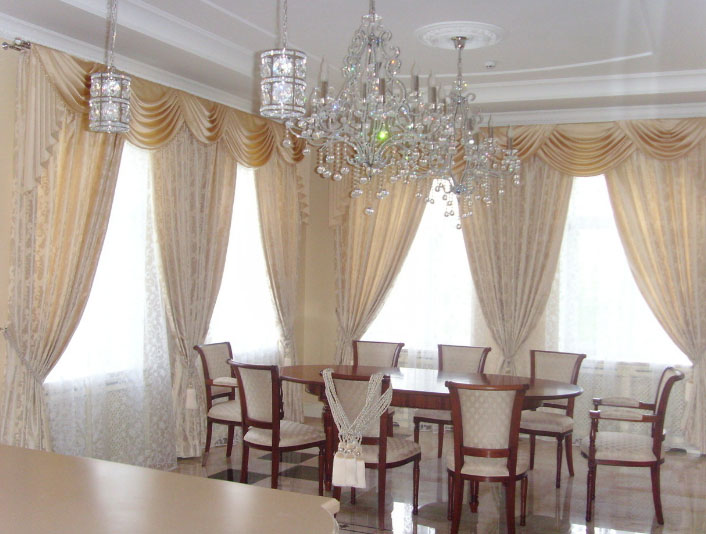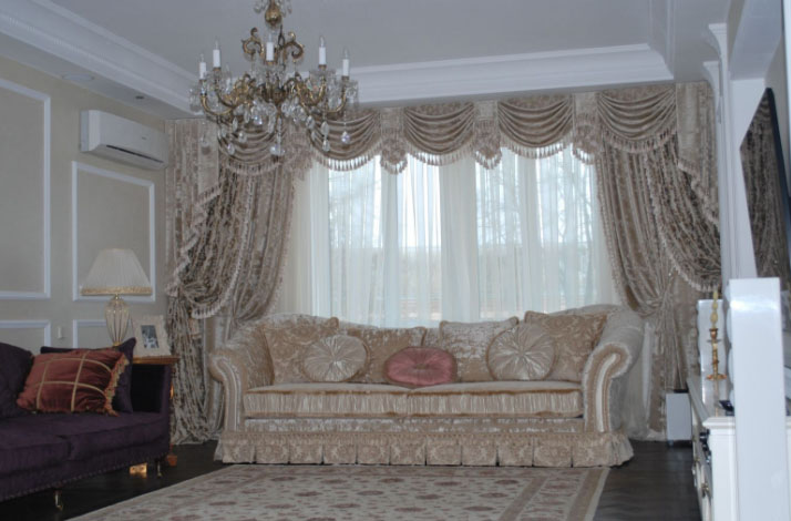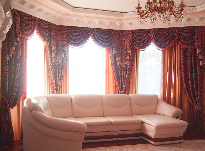 - Шторы с разнообразными ламбрекенами на разных основах и с комбинированными деталями;