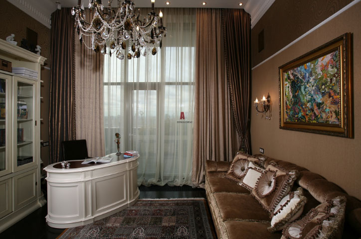 Как видно на фото, конструкция элитных штор обычно отличается своей сложностью. Обычно это многоярусная система, монтаж которой может занять немало времени, а отдельные ее элементы, пошитые из большого количество ткани, могут обладать весом в несколько килограммов. В зависимости от стиля вашего интерьера и конкретной комнаты, шторы могут украшаться изящными бандо, ламбрекенами, свагами. Вы можете разработать любой дизайн по своему вкусу, но основной чертой элитных штор всегда должна оставаться их неповторимость.
