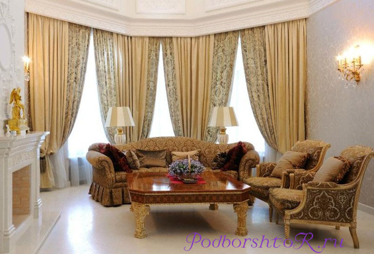 - зал в стиле люкс, несомненно, украсят шторы с изысканной золотистой вышивкой или украшенные хрусталем;