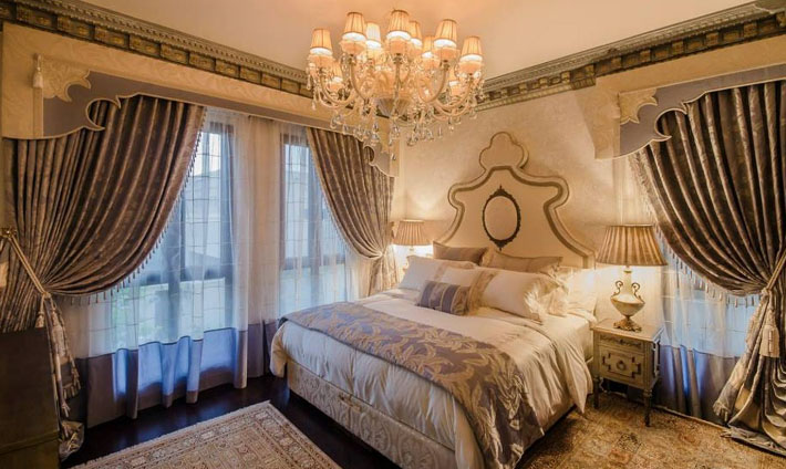 - В спальне роскошь не менее актуальна, чем в гостиной, поэтому о дешевом текстиле нужно забыть.
