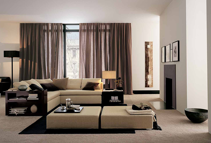 Шторы в теплых тонах могут быть на 2-3 тона темнее или светлее обоев. Если мебель коричневого цвета, то в этом случае можно выбрать шторы в гостиную в шоколадных тонах. Это придаст гостиной элегантности и солидности.