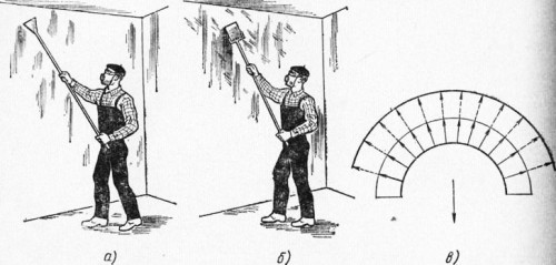Схема очистки стены: а – очистка скребком, б – сглаживание лещадью или шарнирной теркой, в – схема перемещения рабочего инструмента.