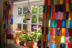 Оформить окно шторами — самое простое решение задачи, связанной с декорированием окна. Шторы вполне можно изготовить из разных лоскутов ткани (фото №2). Главное, чтобы плотность их была приблизительно схожая. Если у вас имеются листы ткани разного размера, сделайте из них одинаковые квадраты и сточите их друг с другом. У вас получатся оригинальные шторы, которые можно повесить с помощью зажимов-колец на штангу. Ваша комната преобразится до неузнаваемости. Если вы не нашли лоскутки тканей для таких штор, обратитесь в ближайшее ателье, наверняка у них есть остатки материала по весьма низкой цене.