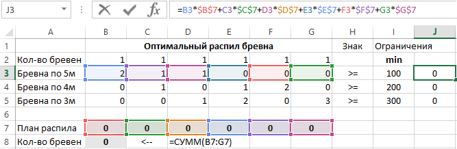 Для расчета левой части ограничения и целевой функции вводятся соответствующие формулы. Ячейки J3:J5 заполоните этими формулами: