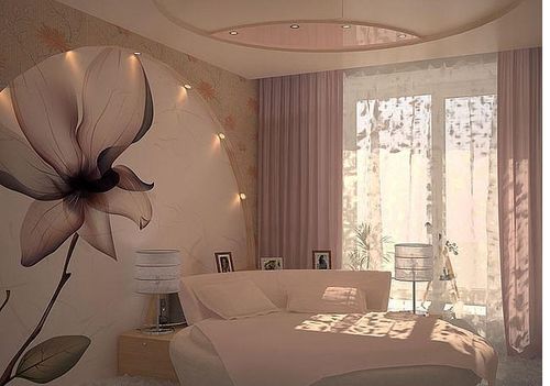 В спальне будут уместны лёгкие короткие шторы из полупрозрачного материала в сочетании с римскими или рулонными шторами. А также простые длинные раздвижные портьеры в комбинации с полупрозрачным тюлем. Визуально увеличить окно можно с помощью потолочного карниза и многослойного ламбрекена их тюля или органзы.