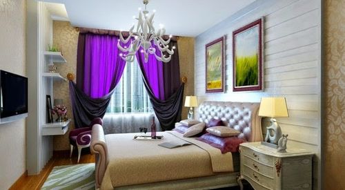 Можно приобрести фиолетовые нежные шторы в спальню, что сделает ее очень комфортной.