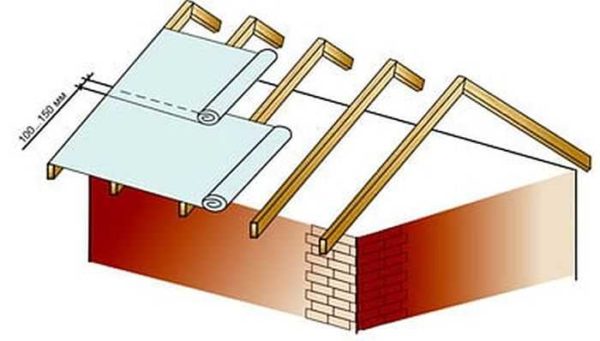 - Сверху на стропила набивается паро-гидроизоляционная мембрана. Она не пропускает пары из дома к кровельному покрытию, и не дает влаге, просочившейся под профлист, попасть на чердак. Набивается она на стропила, крепится не в натяжку, а с провисанием. Расстилать мембрану начинают снизу, продвигаясь вверх. Одно полотнище заходит на второе на 15 см, стык обязательно проклеивается скотчем.
