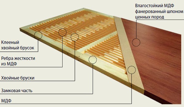 Мазонитовыми называют конструкции, каркас которых сделан из дерева, а обшивка – из ДВП или МДФ. Отличаются такие изделия полупустотным заполнением, в качестве которого может использоваться бумажная «гармошка» с ячейками по 50-150 мм или мелко нарезанные деревянные бруски. Второй вариант получается дороже, но значительно прочнее.
