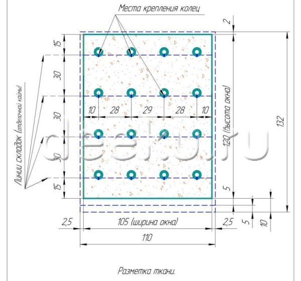 - На кайму пришить колечки.Если штора узкая, достаточно колечек по краям шторы. В случае широкого полотна следует пришивать минимум три кольца в ряд.