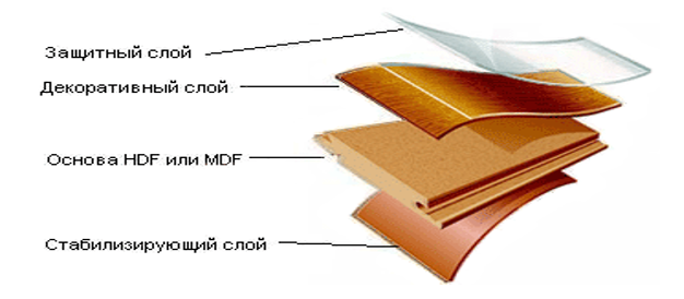 Практически весь ламинат является 4-хслойным материалом. Сверху изделия находится прозрачный слой, выполняющий защитную функцию. Под ними располагают фотографию. Далее, HDF плита и стабилизирующий материал.