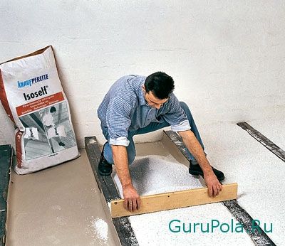 Гидрофобными перлитовыми гранулами диаметром 6 мм. утепляют монолитные полы с твердым покрытием. На основу засыпается перлит, который разравнивается рейками с таким расчетом, чтобы толщина засыпки превышала предусмотренную толщину на 20 процентов. Трубы утапливают в слое сыпучего перлита. Затем поверхность перекрывают плитами и укладывают монолитное покрытие. Несущая способность теплоизоляционной засыпки увеличится, если гранулы вспученного перлита обработать воском.